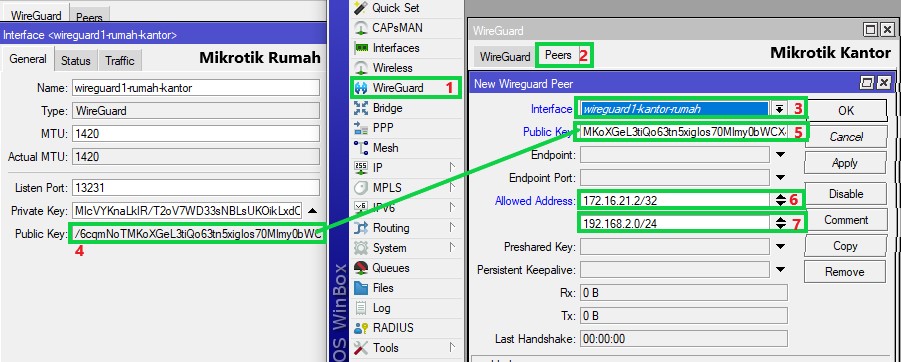 Public Key pada Mikrotik rumah diambil dari Interface Wireguard pada mikrotik kantor (dicopy paste saja),